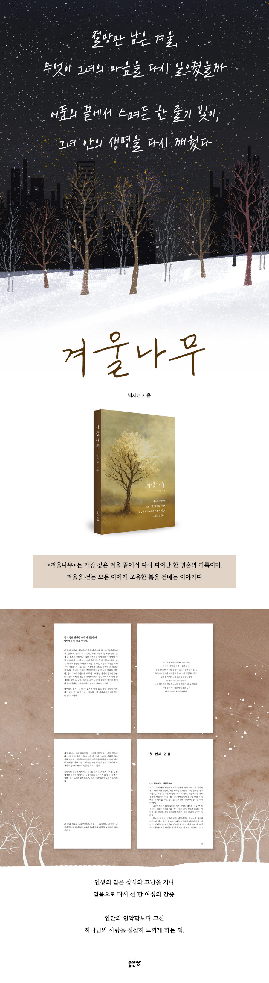 ÃâÆÇ»ç ¼Æò¡®°Ü¿ï³ª¹«¡¯´Â ÇÑ Àΰ£ÀÇ »î ±íÀº °ñÂ¥±â¿¡¼ºÎÅÍ ´Ù½Ã ÇÇ¾î³ ÀºÇýÀÇ ²ÉÀ» ´ã¾Æ³½, ³î¶øµµ·Ï Áø¼ÖÇÑ ¿µÀû ȸº¹ÀÇ ±â·ÏÀÌ´Ù. ÀúÀÚ ¹ÚÁö¼±Àº ¾î¸° ½ÃÀýºÎÅÍ À̾îÁö´Â °¡Á¤ÀÇ »óó, °ÅÀý°¨, ¹«¼Ó°ú Æø·Â, ¹æÈ²°ú ¹ÝÇ×, ±×¸®°í ¸»ÇÒ ¼ö ¾ø´Â Àý¸ÁÀÇ ½Ã°£À» ¼û±è¾øÀÌ ²¨³»¾î ³õ´Â´Ù. µ¶ÀÚ´Â ±×³àÀÇ À̾߱⸦ µû¶ó°¡¸ç, ÇÑ ¿µÈ¥ÀÌ ¹«³ÊÁö°í ´Ù½Ã ¼¼¿öÁö´Â °úÁ¤À» ¸ñµµÇÏ°Ô µÈ´Ù.