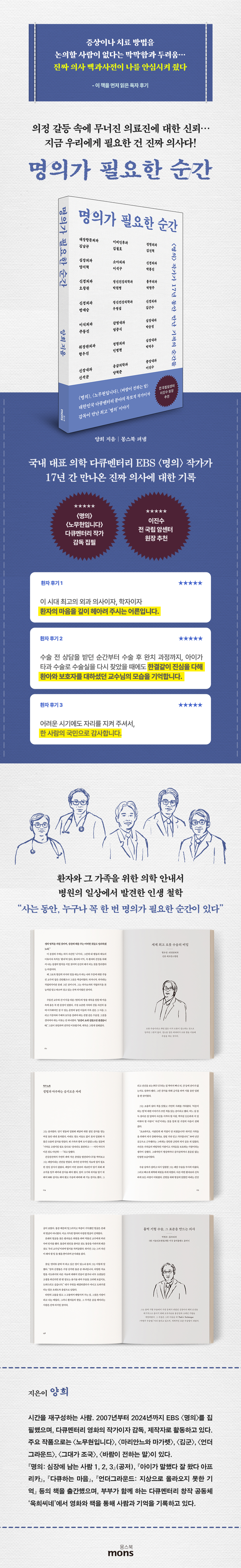 ±¹³» ´ëÇ¥ ÀÇÇÐ ´ÙÅ¥¸àÅ͸® EBS ¡´¸íÀÇ¡µ¸¦ 17³â°£ ÁýÇÊÇÑ ÀÛ°¡ÀÇ ±â·ÏÀÌ Ã¥À¸·Î ´Ù½Ã ž´Ù. ¡º¸íÀǰ¡ ÇÊ¿äÇÑ ¼ø°£¡»Àº ´ëÇѹα¹ ¸íÀǵéÀÇ ÁøÂ¥ À̾߱â¿Í ÁÖ¿ä Áúº´ÀÇ ½ÇÁ¦ Ä¡·á ÇöÀåÀ» ´ã¾Ò´Ù. ÀúÀÚ´Â ¼ö¼ú½Ç°ú Áø·á½ÇÀ» ¿À°¡¸ç ȯÀÚ¿Í ÀÇ»çÀÇ »îÀ» µ¿½Ã¿¡ ±â·ÏÇÑ »ý»ýÇÑ ÀÇ·á ´ÙÅ¥¸àÅ͸®¸¦ ¿Ï¼ºÇß´Ù. Ã¥¿¡´Â ´ëÀå¾Ï, À§¾Ï, ½ÉÀåÁúȯ, ³úÇ÷°üÁúȯ, °£À̽Ä, Á¤½Å°Ç°, °¨¿°º´ µî Çö´ëÀÎÀÇ »î°ú °¡Àå ¹ÐÁ¢ÇÑ Áúº´µéÀÌ ¼Ò°³µÇ¸ç ȯÀÚ¿Í ±× °¡Á·µéÀÌ ÀÇ·á ÇöÀåÀ» µÎ·Á¿òÀÌ ¾Æ´Ñ ½Å·ÚÀÇ ¸¶À½À¸·Î ¹Ù¶óº¼ ¼ö ÀÖ°Ô ÇØÁØ´Ù.