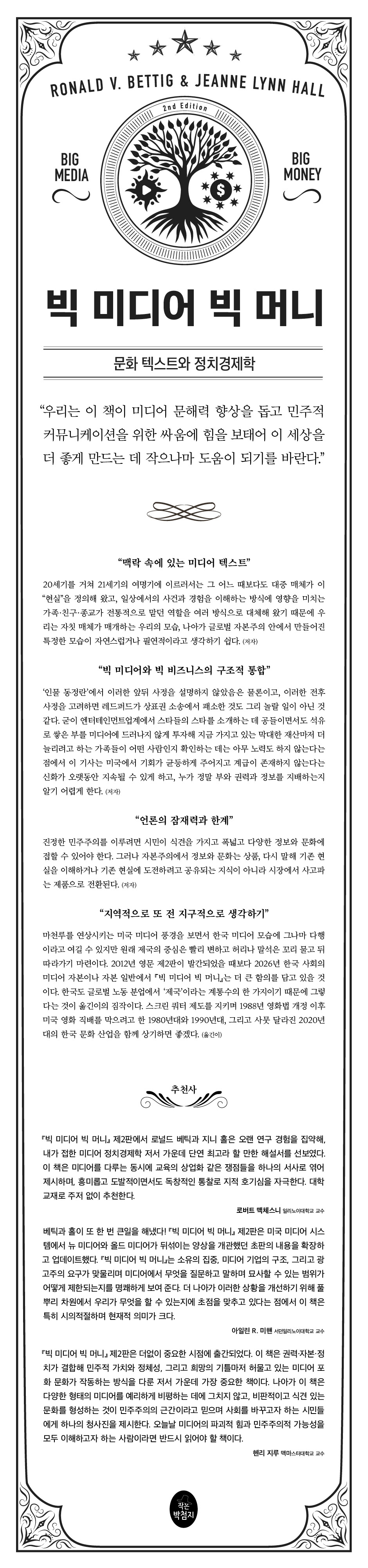 ¹æ¹ý·ÐÀûÀ¸·Î´Â ´ë¾È ¾ð·ÐÀ» »ç¿ëÇÔÀ¸·Î½á ÁúÀû ¿¬±¸¿¡¼ ÇϳªÀÇ ±âº»Àû ¹æ¹ýÀ̱⵵ ÇÑ ºñ±³Àû °üÁ¡À» Á¦°øÇÑ´Ù. ¿¹¸¦ µé¾î ¿ì¸®´Â ÇöÀå¿¡ ÆÄ°ßµÈ ±âÀÚ°¡ ÀÛ¼ºÇÑ ¼¼°è¹«¿ª±â±¸(WTO)¿Í ±¹Á¦Åëȱâ±Ý(IMF) ¹Ý´ë ½ÃÀ§¿¡ °üÇÑ ÁÖ·ù ¾ð·ÐÀÇ º¸µµ¿Í ½ÇÁ¦·Î ÇöÀå¿¡ Âü¿©ÇÑ È°µ¿°¡°¡ ÀÛ¼ºÇÑ ´ë¾È ¾ð·ÐÀÇ ±â»ç¸¦ ºñ±³ÇÑ´Ù. ±× Â÷ÀÌ´Â ³î¶ó¿ï Á¤µµÀε¥, ÀÌ·¯ÇÑ Â÷À̰¡ ³ª´Â ÀÌÀ¯´Â µÚ¿¡¼ Á» ´õ ÀÚ¼¼ÇÏ°Ô µé¿©´Ùº¼ °ÍÀÌ´Ù. (29ÂÊ) ÀüüÀûÀ¸·Î º¼ ¶§µµ ¹Ìµð¾î ºÎ¹®Àº ÁýÁߵǾî ÀÖ°í °³º°ÀûÀ¸·Î º¼ ¶§µµ ¹Ìµð¾î »ê¾÷Àº ÁýÁߵǾî ÀÖ´Ù. °³º° ¹Ìµð¾î »ê¾÷Àº ºò ¹Ìµð¾î¶ó´Â ³ª¹«Áٱ⿡¼ »¸¾î ÀÚ¶ó´Â °èÅë¼öÀÇ ³ª¹µ°¡Áö¿¡ ÇØ´çÇÑ´Ù. (32ÂÊ) ±³Â÷ ¼ÒÀ¯, ±â¾÷ ¼³¸í Ȱµ¿, ÀÌ»çÁ÷ °âÀÓ, Á¶ÀÎÆ® º¥Ã³·Î ºò ¹Ìµð¾î¿Í ºò ºñÁî´Ï½º´Â ±¸Á¶ÀûÀ¸·Î ÅëÇյȴÙ. (75ÂÊ) ¡°¿ì¸® ȸ»ç´Â »çȸ ÀüüÀÇ ÀÌÀÍÀ» À§ÇØ ÀÏÇÒ °ÍÀÌ´Ù.¡± ÄÉÀ̽º°¡ ¡°¼¼°è¿¡¼ °¡Àå Á¸°æ¹Þ´Â ȸ»ç¡±·Î ¸¸µé°Ú´Ù¸ç Æ÷ºÎ¸¦ ¹àÈ÷ÀÚ ·¹ºóµµ ÇѼú ´õ ¶° ÀÚ½ÅÀÇ ¹Ù¶÷À» ¹àÇû´Ù. ¡°´õ ÁÁÀº ¼¼»óÀ» ¸¸µé°í ½Í´Ù.¡± ±×µéÀÌ »ç´Â ¼¼»ó¿¡¼ ´õ ÁÁÀº ¼¼»ó ¸¸µé±â¶õ ŸÀÓ¿ö³ÊÀÇ ºê·£µå·Â°ú AOLÀÇ ¸¶ÄÉÆÃ·Â¡¤¹è±Þ·ÂÀ» ÇÕÄ¡±â ±× ÀÌ»óµµ ÀÌÇϵµ ¾Æ´Ï¾ú´Ù. ±Â¸ÇÀÌ °á·ÐÀ» ³»¸° ¹Ù¿Í °°ÀÌ ±× ¹æ¼Û¿¡¼ ÇÕº´µÈ ȸ»ç°¡ ¸¸µé¾î ³»´Â »ý»ê¹°ÀÇ Ç°Áú Çâ»ó°ú ´Ù¾ç¼º ÁõÁøÀ» µÎ°í´Â ÀϾð¹Ý±¸µµ ¾ø¾ú´Ù. (58ÂÊ) ±×·±µ¥µµ ÀÌ ³íÀïÀÇ Çâ¹æÀº ½ÄÀ½·á¾÷°è ´ë±â¾÷ÀÌ °áÁ¤ÇÏ°í ºò ¹Ìµð¾î°¡ º¸µµÇÑ ¹Ù¿Í °°ÀÌ À§±â¿¡ ºüÁ® ÀÖ´Â Çб³µéÀÌ °è¾à ºÒÀÌÇà°ú °ü·ÃÇØ û·®À½·á ȸ»çµé¿¡ ¡®°øÁ¤Çϰԡ¯ º¸»óÇØ¾ß ÇÏ´ÂÁö ¿©ºÎ¸¦ Áß½ÉÀ¸·Î ÀÌ·ç¾îÁ³´Ù. ź»êÀ½·á Á¦Á¶¾÷ü¿Í Á¦Á¶»ç°¡ ¾àÅ»Àû Àü·«À» ±¸»çÇ߱⠶§¹®¿¡ ºÒÀÌÀÍÀ» °¨¼öÇØ¾ß ÇÑ´Ù´Â ÀǰßÀº ¾Æ¿¹ Á¦±âµÇÁöµµ ¾Ê¾Ò´Ù. ¾Æ¿ï·¯ °ø¸³ Çб³°¡ ¿Ö ´Ù¸¥ °÷ÀÌ ¾Æ´Ï¶ó ±â¾÷À¸·ÎºÎÅÍ ÀÚ±ÝÀ» È®º¸Çؾ߸¸ ÇÏ´ÂÁö¿Í °°Àº ´õ Å« ÀïÁ¡Àº °ÅÀÇ ´Ù·ç¾îÁöÁö ¾Ê¾Ò´Ù. (394ÂÊ) µû¶ó¼ ºò ¹Ìµð¾î´Â ½Ã¹ÎÀÌ ´ë¾ÈÀû Çö½ÇÀ» »ó»óÇÏÁö ¸øÇÏ°Ô ÇÑ´Ù. ºò ¹Ìµð¾î´Â ¿ª»ç¸¦ ¸¸µé¾î ³ª°¡´Â Àΰ£ÀÇ Èûµµ ºÎÁ¤ÇÑ´Ù. ´õ ³ª¾Æ°¡ ºò ¹Ìµð¾î´Â Àΰ£ÀÌ »õ·Î¿î ¹æ½ÄÀ¸·Î »ì ¼ö ÀÖ´Ù´Â »ý°¢µµ ÇÏÁö ¸øÇÏ°Ô ÇÑ´Ù. Àΰ£ÀÇ ÀáÀç·ÂÀ» ¿ÂÀüÈ÷ ½ÇÇöÇÏ°Ô ÇÒ ¹Ù·Î ±× »ý°¢ ¸»ÀÌ´Ù. (461ÂÊ) ¿ì¸®´Â ¾ÕÀ¸·Î ÀÖÀ» ÅõÀï¿¡¼ ´ë¾ÈÀû ¸ñ¼Ò¸®°¡ ±× ¾î´À ¶§º¸´Ù Áß¿äÇØÁú °ÍÀ̶ó°í ÁÖÀåÇÑ´Ù. (30ÂÊ) ÃâÆÇ»ç ¼Æò¡ººò ¹Ìµð¾î ºò ¸Ó´Ï¡»ÀÇ ¿µ¹® ÃÊÆÇÀº ´ë¾ÈÀû Áö¿ª ½Å¹®ÀÎ ¡ºº¸À̽º¿Àºê¼¾Æ®·²Ææ½Çº£À̴Ͼơ»(Voices of Central Pennsylvania)¿¡ ¡¸ºñÆ® ´õ ÇÁ·¹½º¡¹¶ó´Â Á¦¸ñÀ¸·Î ¿¬ÀçµÇ¾ú´ø ¹Ì±¹ ¹Ìµð¾î ºñÆòÀ» ¹ÙÅÁÀ¸·Î 2003³â¿¡ ÃâÆÇµÇ¾ú´Ù. ÀÌ ¹ø¿ªº»Àº °°Àº Á¦¸ñÀ¸·Î 2012³â¿¡ ÃâÆÇµÈ ¿µ¹® Á¦2ÆÇÀ» Çѱ¹¾î·Î ¿Å±ä °ÍÀÌ´Ù. ¡ººò ¹Ìµð¾î ºò ¸Ó´Ï¡»´Â ¹«¾ùº¸´Ù ºò ¹Ìµð¾î¿Í ºò ¸Ó´Ï¸¸ÀÇ ¼º´ëÇÑ Ç⿬À» »ý»ýÇÏ°Ô º¸¿© ÁÖ¸é¼, ¿ì¸® ½Ã´ëÀÇ ¹Ìµð¾î¡¤¹®È¡¤±³À° ¿µ¿ª¿¡¼ ÀÚº»ÁÖÀÇÀÇ ÀÏ¹Ý ¹ýÄ¢ÀÎ °æÀï°ú ÃàÀûÀÌ ¾î¶»°Ô ÀÛµ¿ÇÏ´ÂÁö, ³ª¾Æ°¡ µ¿½Ã´ë ¹Ìµð¾î°¡ »çȸÀûÀ¸·Î ¾î¶² ¿ªÇÒÀ» ¼öÇàÇÏ´ÂÁö¸¦ µ¶ÀÚ°¡ ÀÌÇØÇÏ´Â µ¥ µµ¿òÀ» ÁØ´Ù.
