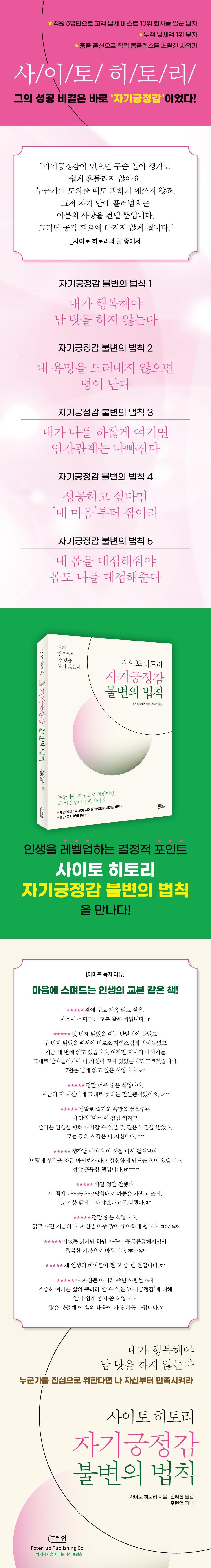 ÀÌ¹Ì ¼ö¸¹Àº ÀÚ±â°è¹ß º£½ºÆ®¼¿·¯¸¦ ÅëÇØ ¡®ºÎ¸¦ ²ø¾î´ç±â´Â ¹ý¡¯, ¡®Çà¿îÀ» ºÎ¸£´Â ŵµ¿Í ¸»Åõ¡¯¿¡ ´ëÇØ À̾߱âÇØ¿Â »çÀÌÅä È÷Å丮°¡ À̹ø¿¡´Â ÀÚ±â±àÁ¤·ÐÀ» µé°í µ¹¾Æ¿Ô´Ù. ±×´Â ¾Æ¹«¸® µ· ¸¹Àº Áý¾È¿¡¼ ž¾îµµ ȤÀº ½º½º·Î ³ë·ÂÇØ¼ ¼º°øÇß´Ù°í ÇÏ´õ¶óµµ ³»¸éÀÌ ÀÚ±â±àÁ¤°¨À¸·Î ä¿öÁ® ÀÖÁö ¾ÊÀ¸¸é ÀÚ±â Àλý¿¡ ´ëÇÑ ¸¸Á·°¨ÀÌ ³·±â ¶§¹®¿¡ Çàº¹ÇØÁö±â Èûµé´Ù°í ¸»ÇÑ´Ù. ¶Ç »õ·Î¿î ÀÏ¿¡ µµÀüÇϰųª »ç¶÷À» »ç±Ð ¶§¿¡µµ ÀÚ±â±àÁ¤°¨Àº Áö´ëÇÑ ¿µÇâÀ» ¹ÌÄ£´Ù. ÇѸ¶µð·Î ÀÚ±â±àÁ¤°¨Àº »îÀÇ ÁúÀ» °áÁ¤ÇÏ´Â ¹Ù·Î¹ÌÅÍÀÎ °ÍÀÌ´Ù.